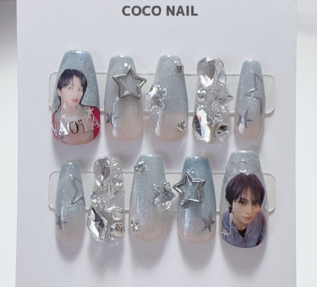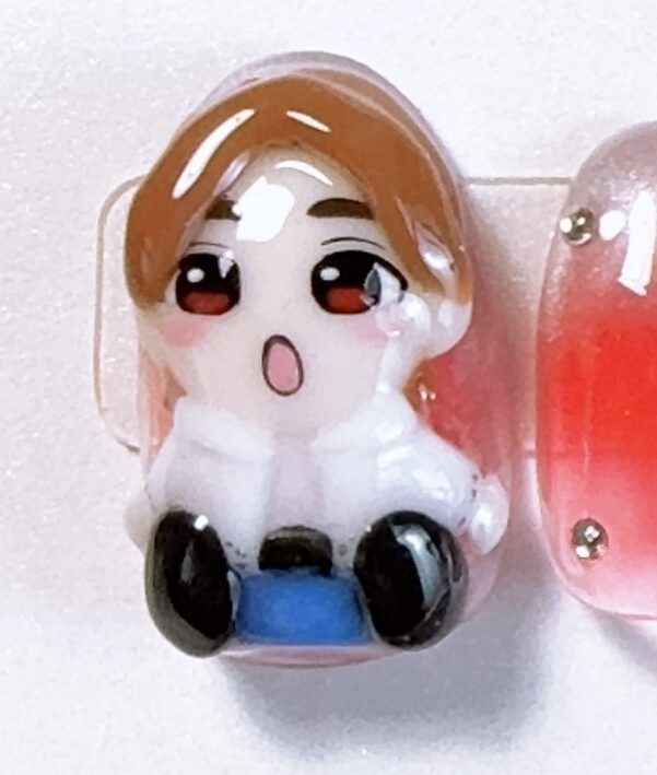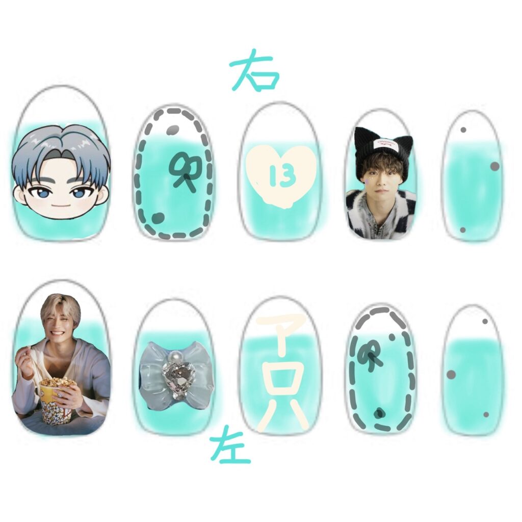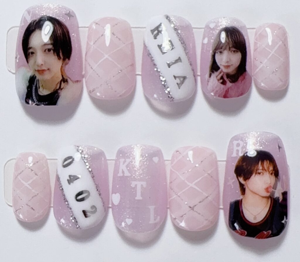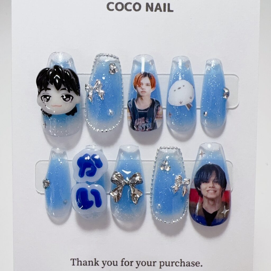 推しの衣装に合わせたデザインネイル。複雑な模様やデザインの場合は追加料金になるので、お見積もりいたします。