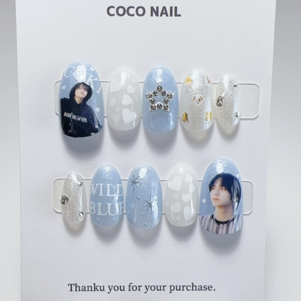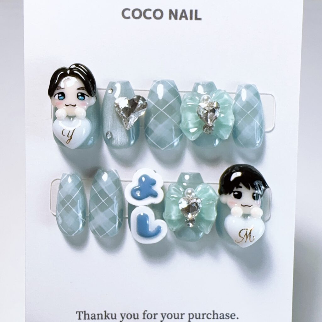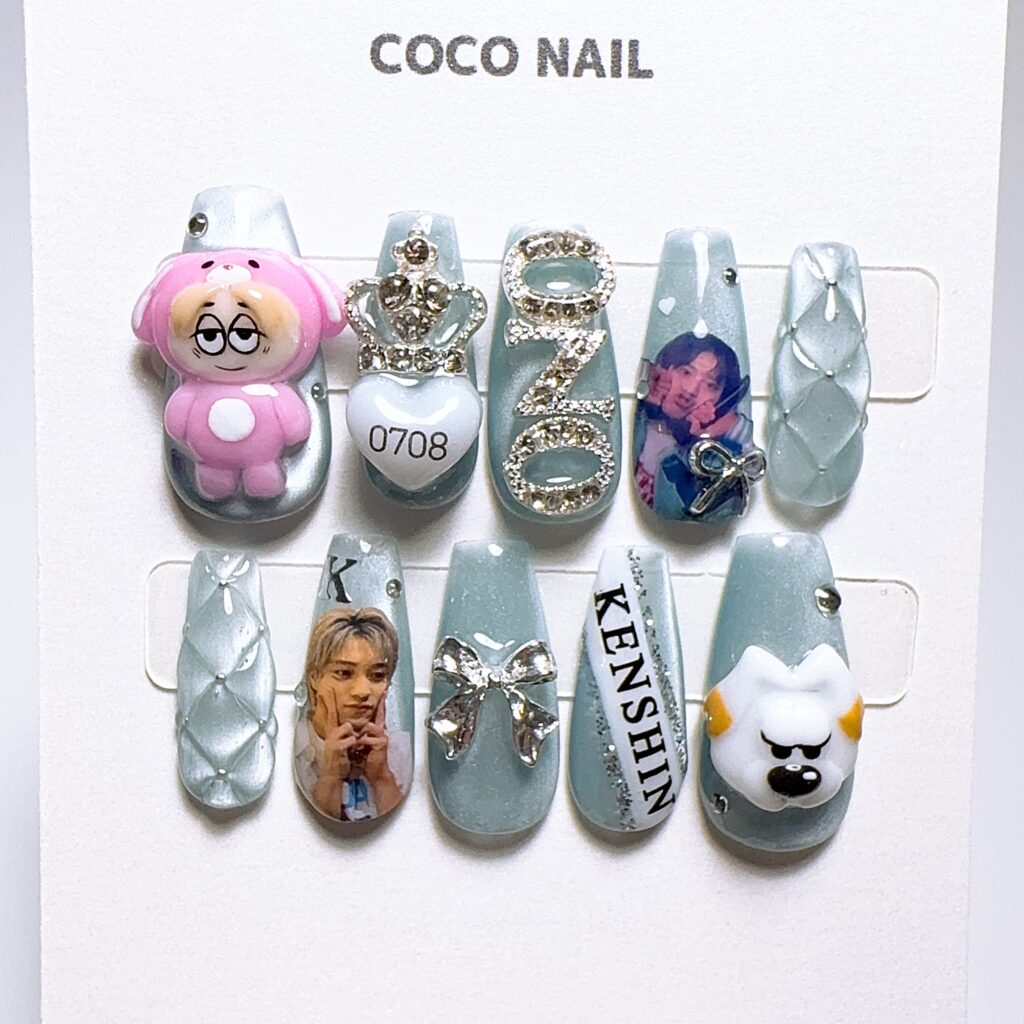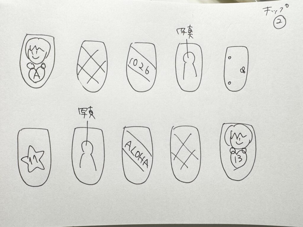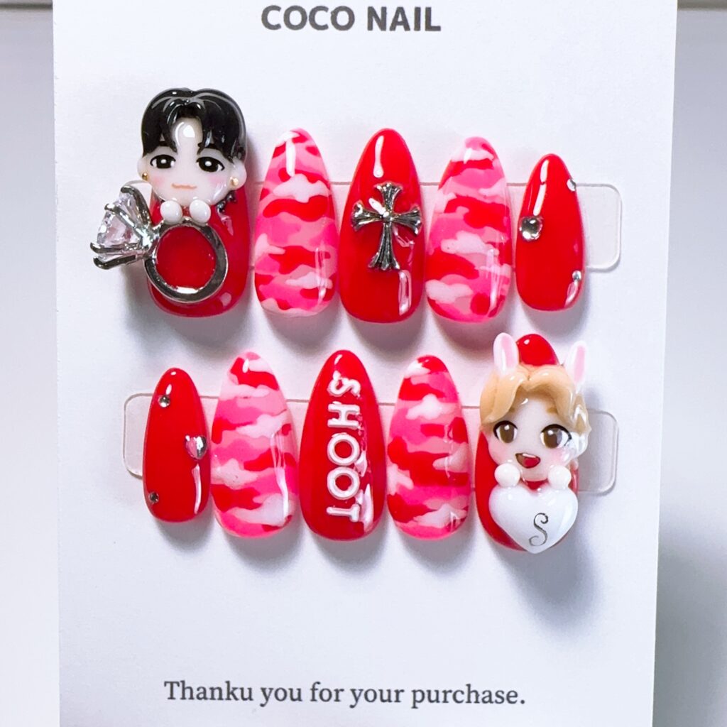 推しの衣装に合わせたデザインネイル。複雑な模様やデザインの場合は追加料金になるので、お見積もりいたします。