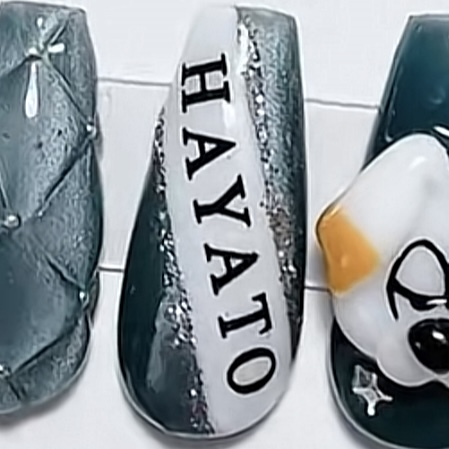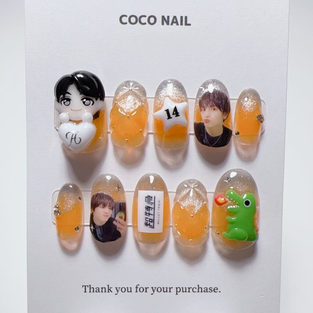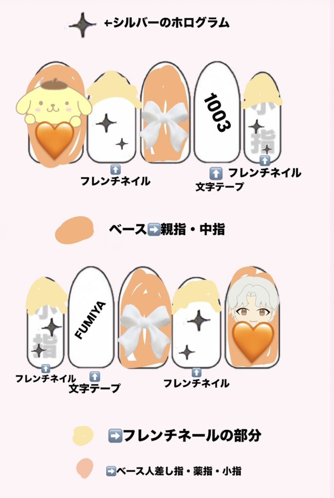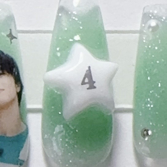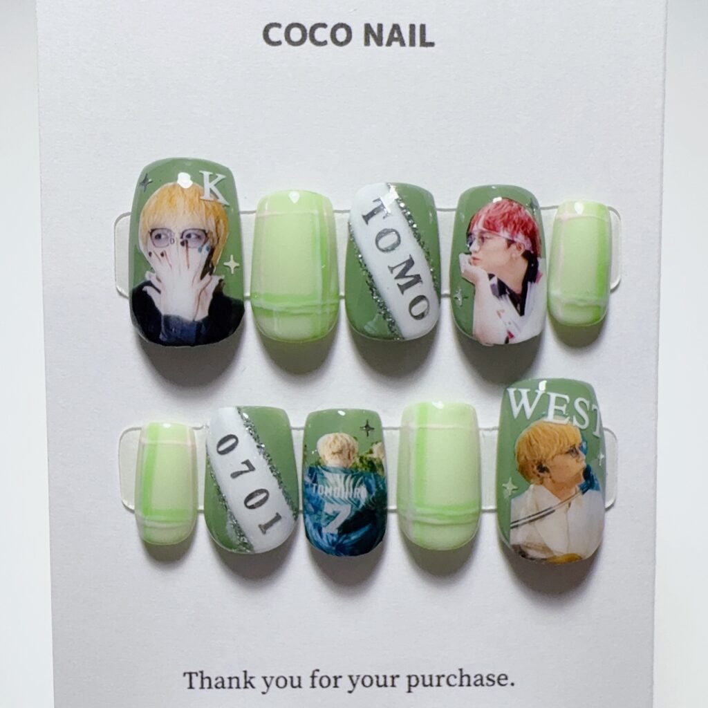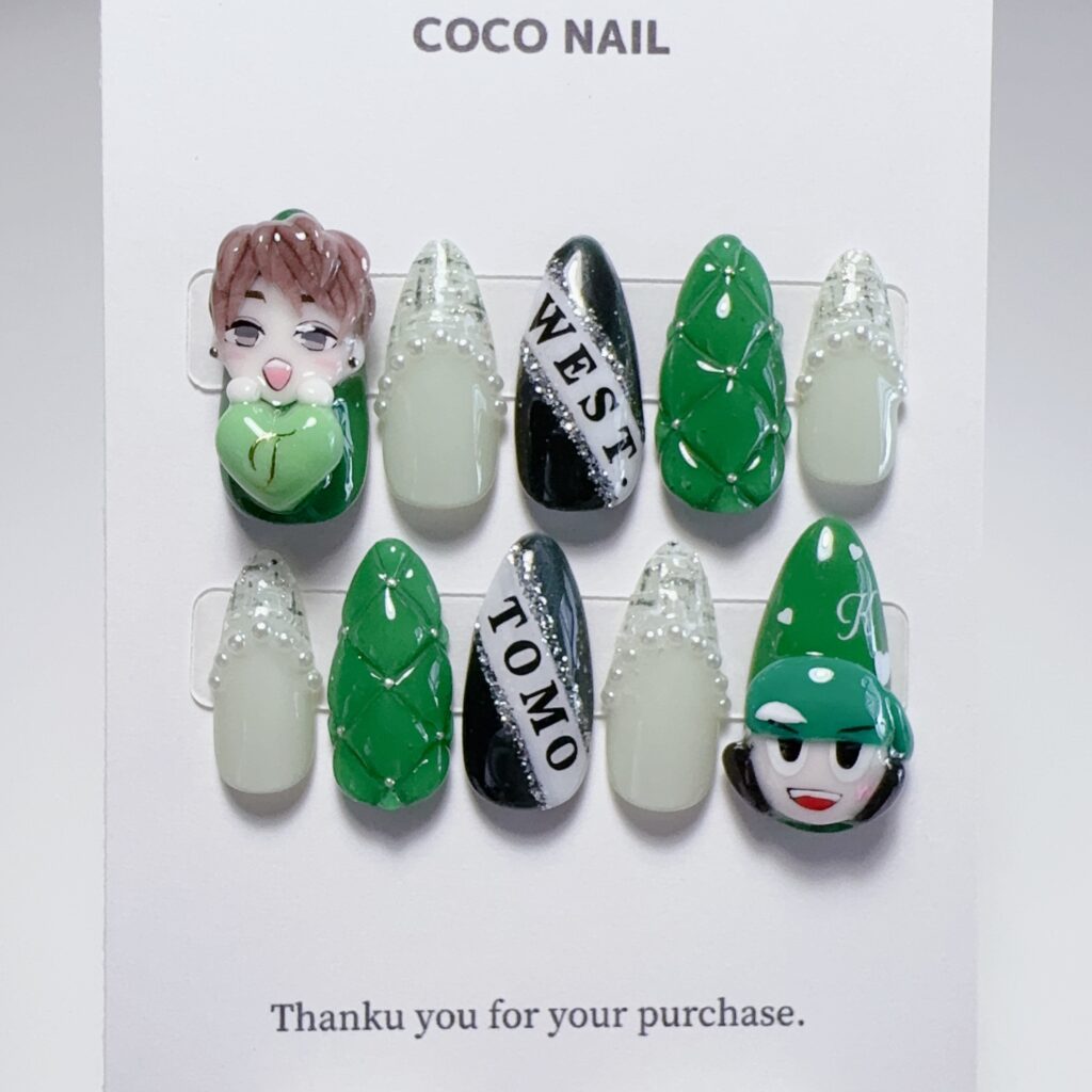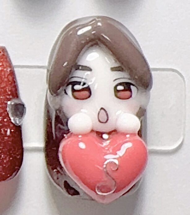 推しの衣装に合わせたデザインネイル。複雑な模様やデザインの場合は追加料金になるので、お見積もりいたします。