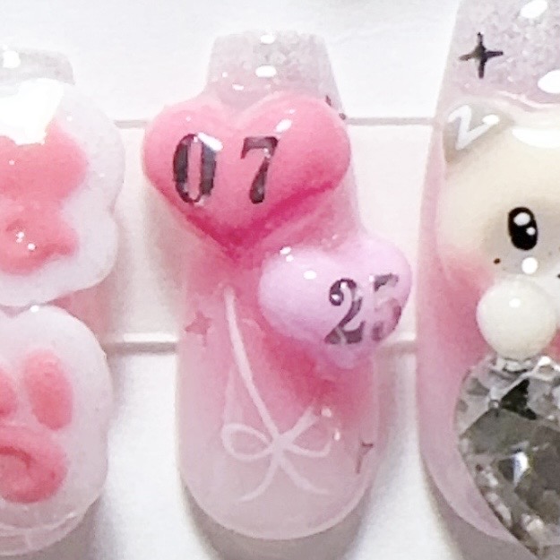 キャラにハートの3Dを持たせたものです。イニシャルシールを貼ることができます。指輪、ハートストーン、ロゴパーツ、星3Dなどお好きなパーツを持たせることが可能です。