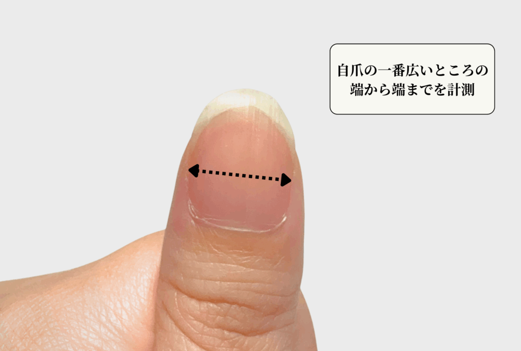 爪の幅が最も広い部分に、メジャーを巻き付けるようにし、爪にぴったり添わせて測ります。