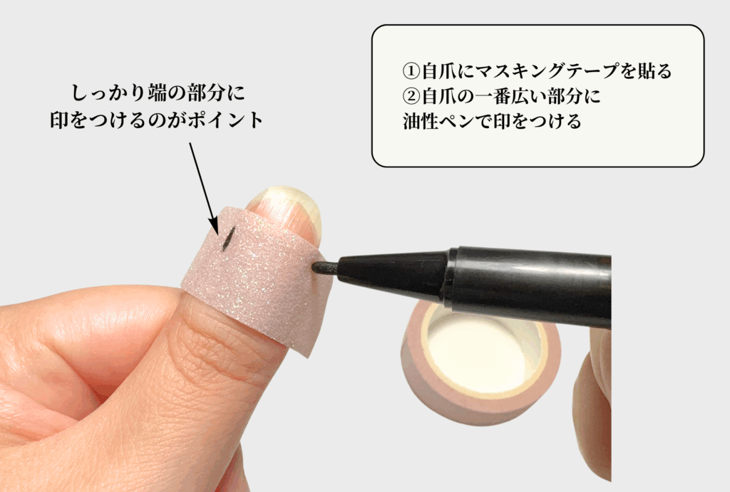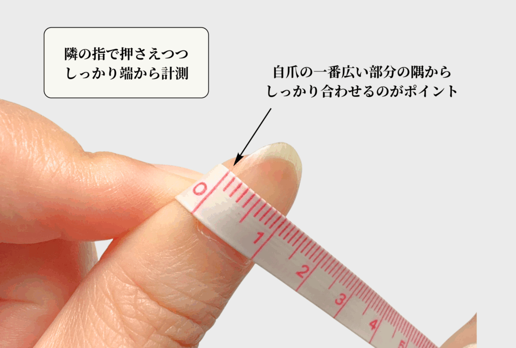 計測用チップを受け取りましたら、上記のように根元とサイドを合わせてサイズを計測してください。