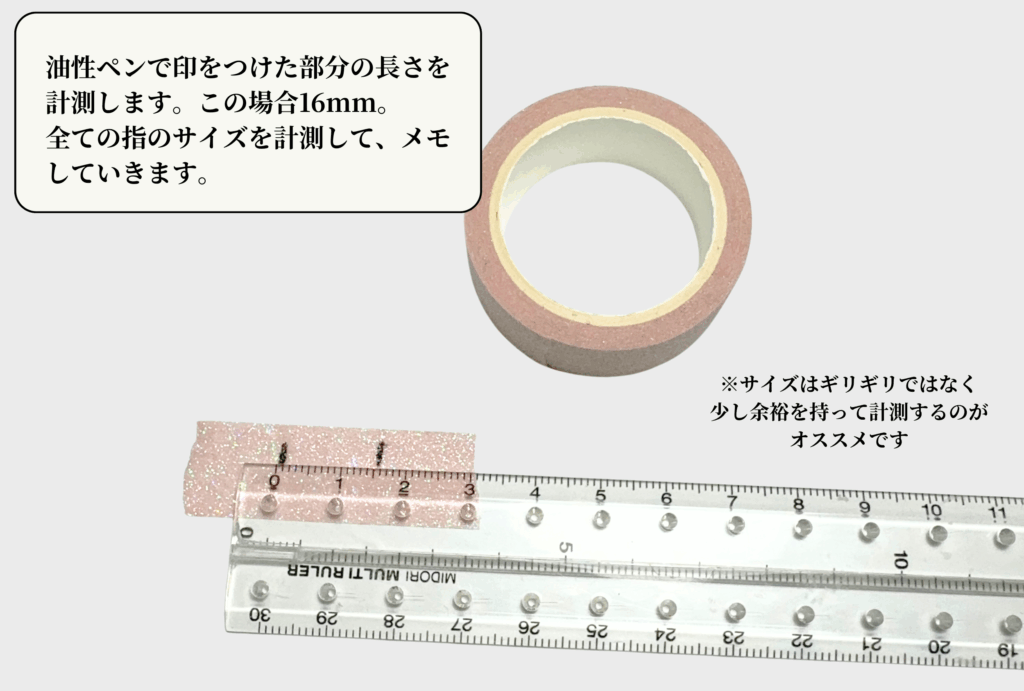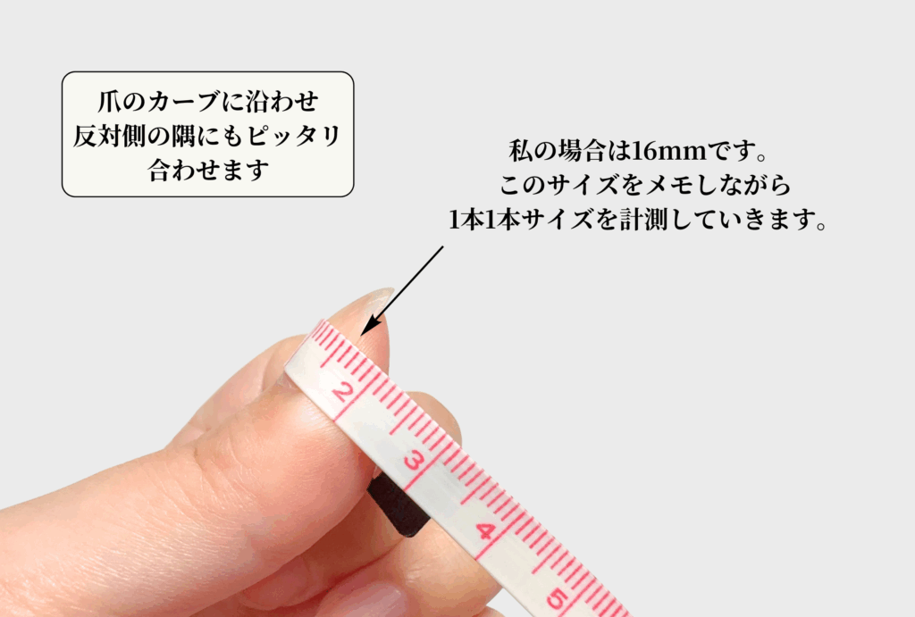 「右手は親指から13mm.10mm.11mm.10mm.8mm」といった具合で、爪の横幅のサイズをメモしていきます。