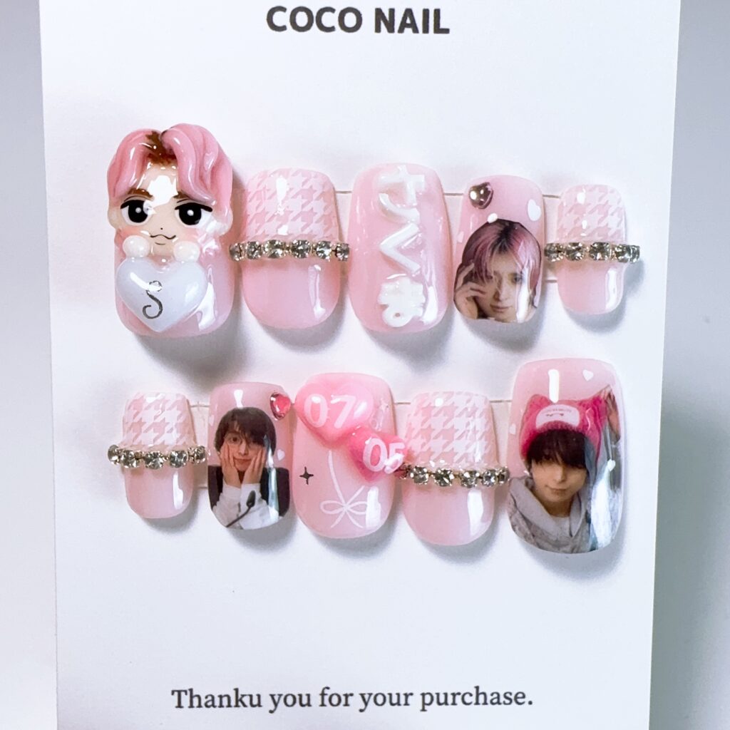 自爪から少し長さがあるネイルチップですが、角があるため少し引っかかりやすい形ではあります。ですが、範囲が広くアートの幅も広がるのと強度があり壊れにくい形になります。3Dは人物がハート持ったものを乗せることができます。