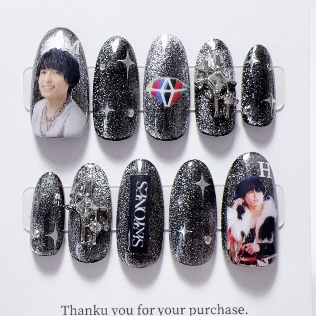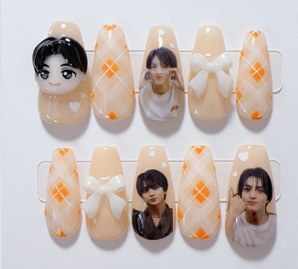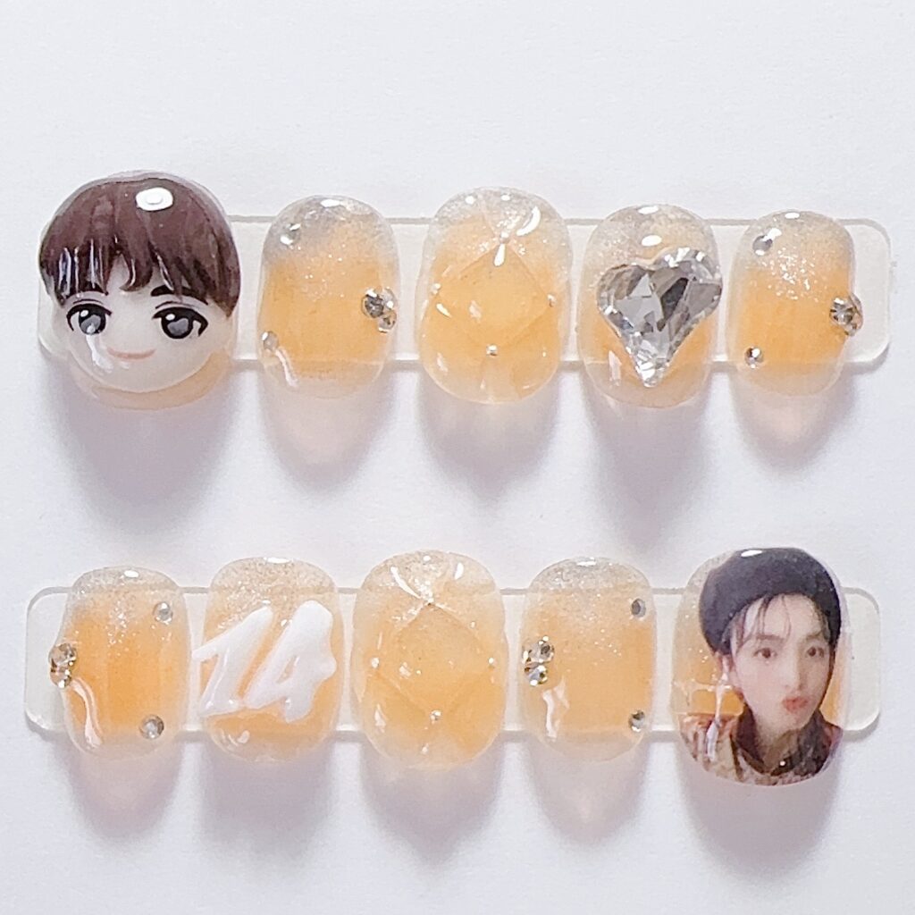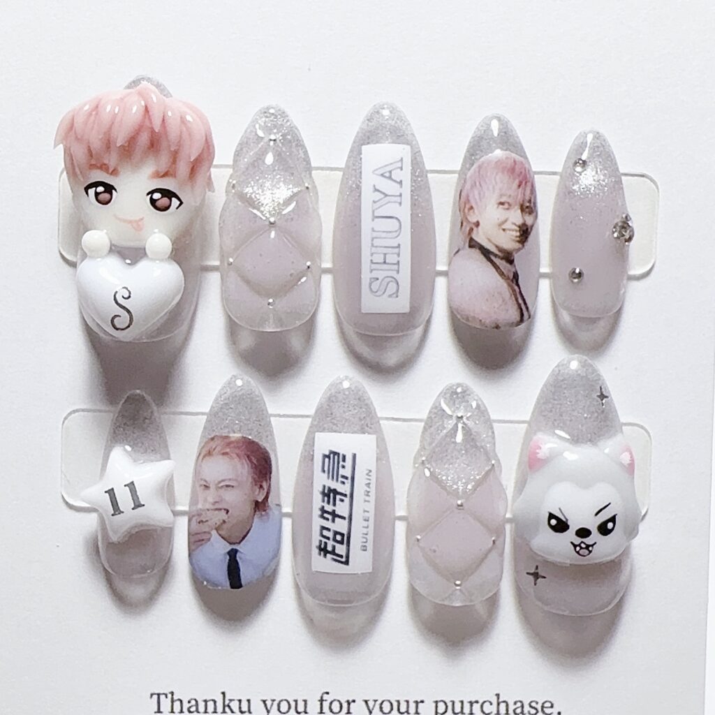 自爪から少し長さがあるネイルチップで扱いやすく人気の形です。初心者の方や、長いチップが苦手な方にもオススメです。3Dは人物がハート持ったものを乗せることができます。