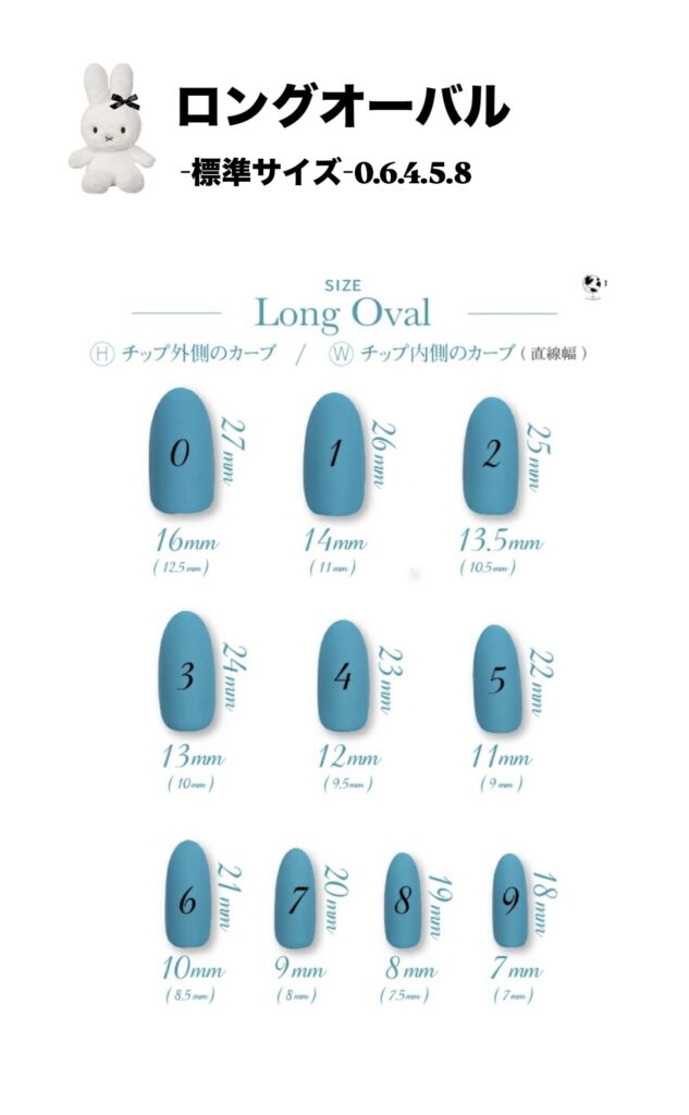長さがあるネイルチップになります。大きいサイズでもシャープな作りなので、親指の幅が広めな方は少しキツく感じるかもしれません。シャープな形で手が綺麗に見えます。